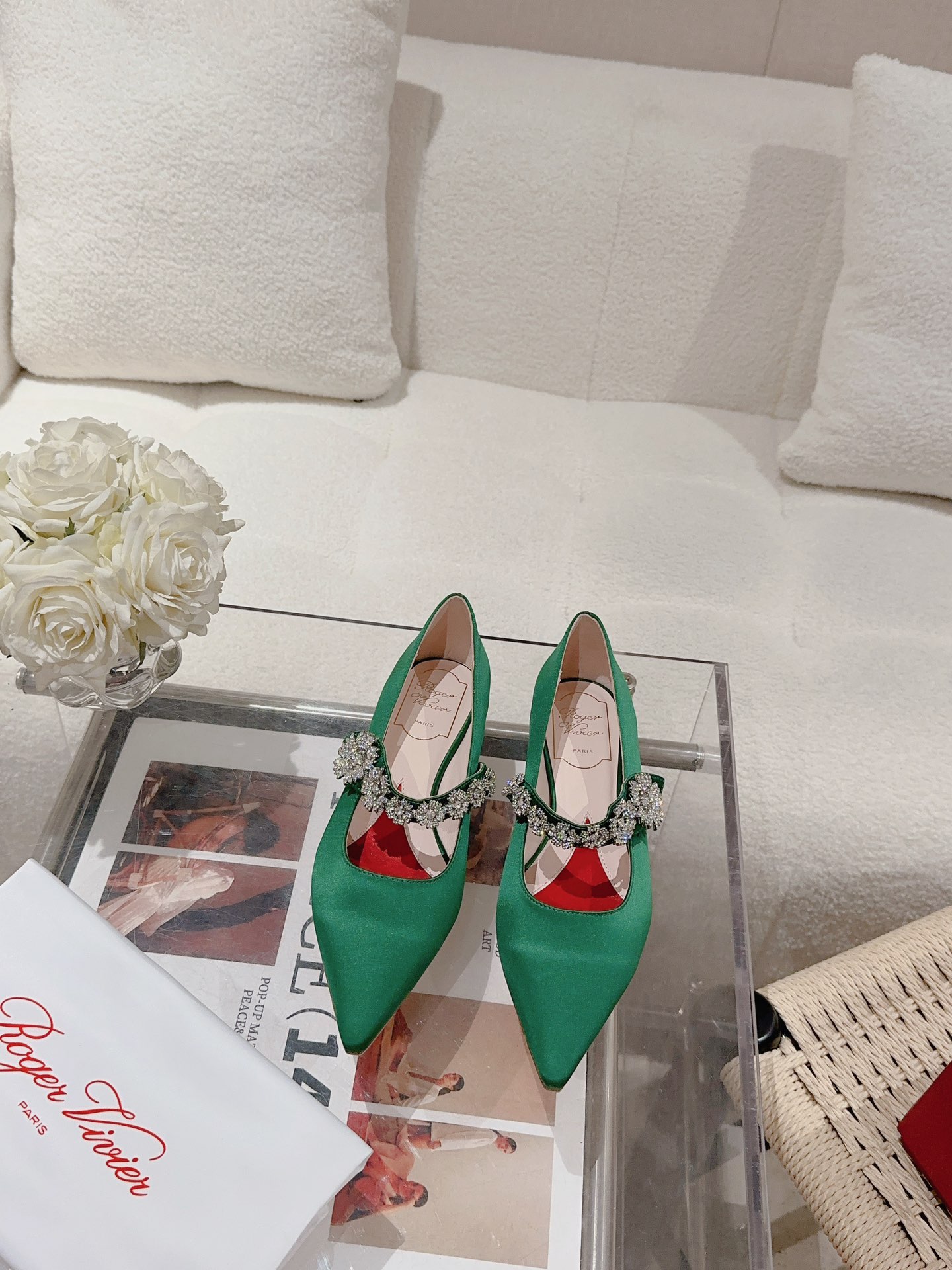 Roger Vivier 2023 SS silk pointed shoes with crystal buckle. Available in flat, 3.5cm low heel, 8.5cm high heel. Sizes 35-39, custom 34 & 40. Luxury packaging.
