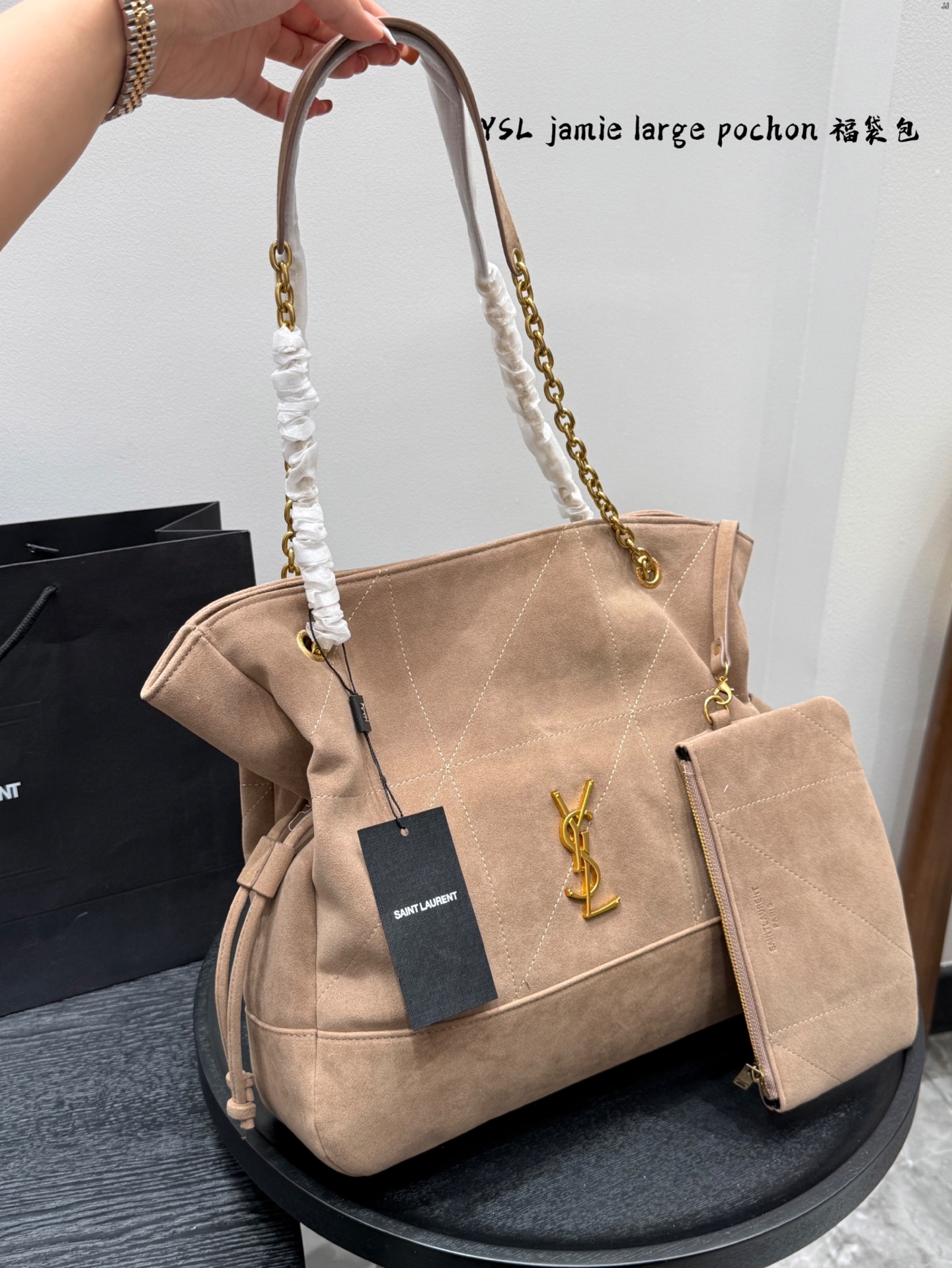 Suede and nubuck leather, size: 31.33cm. YSL Jamie large pouch tote bag, also called lucky bag, drawstring chain tote. Durable fabric, stylish underarm tote. Search: trash bag.