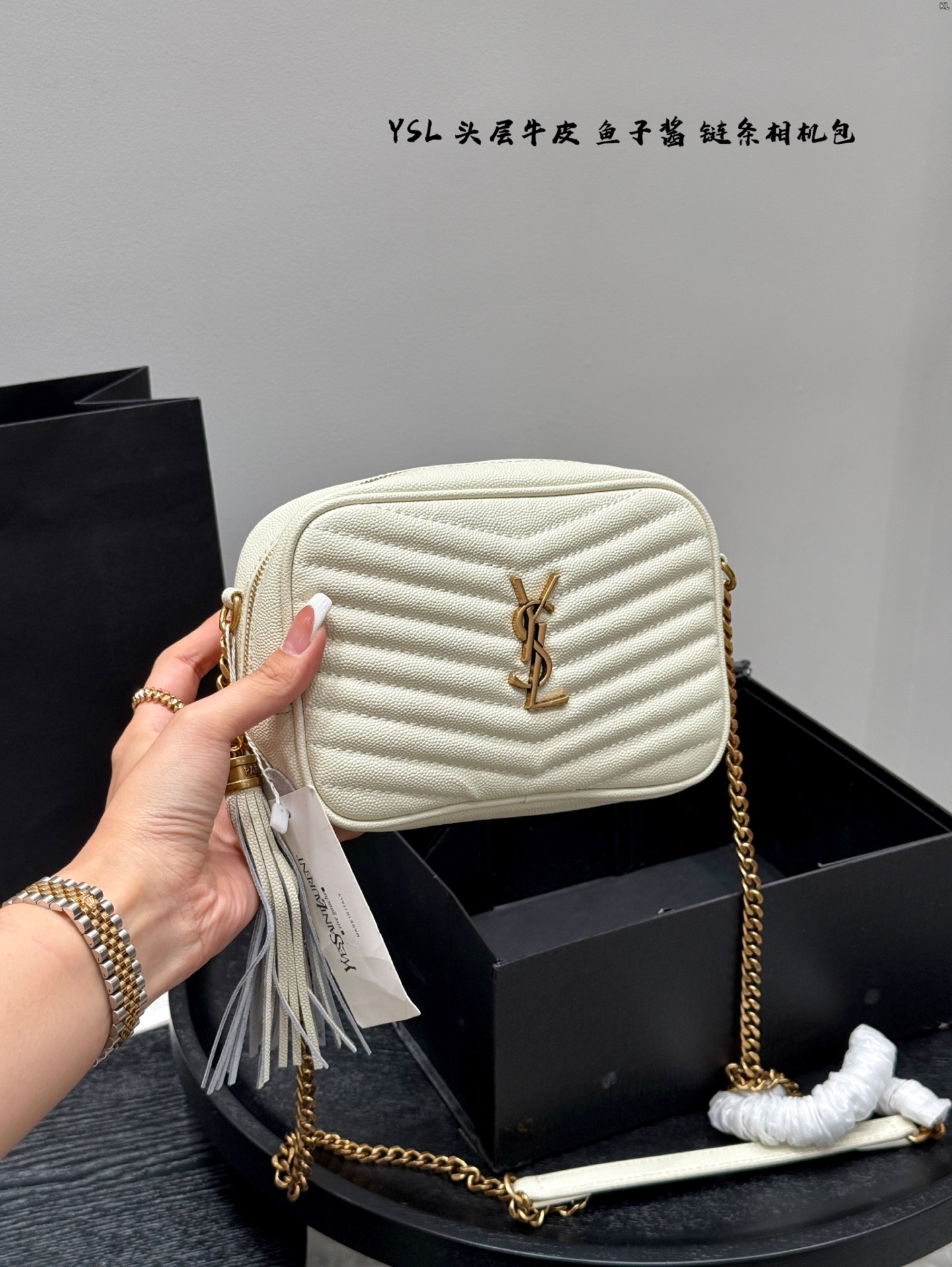 YSL caviar camera bag with tassel, compact size 18*14cm, classic design with chain and leather strap.