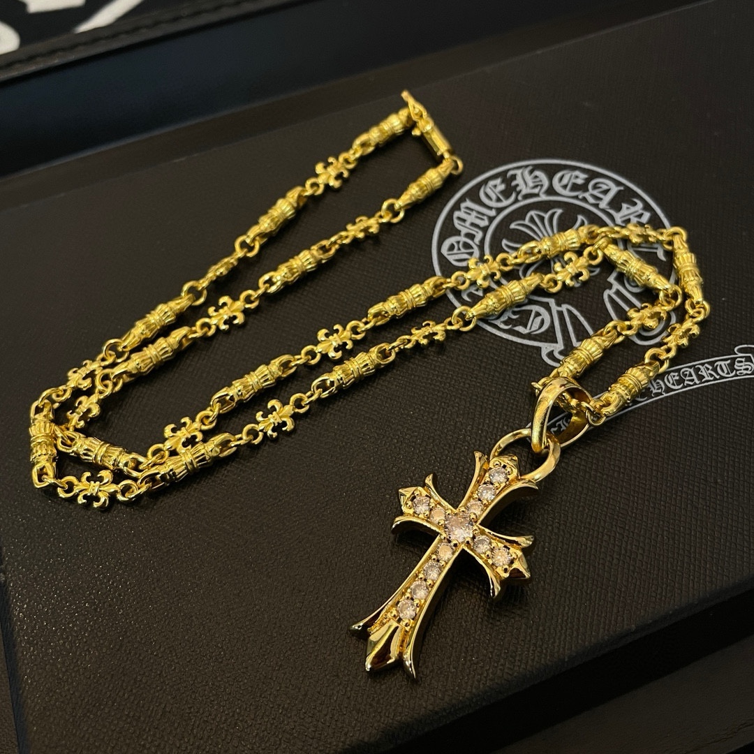 Chrome Hearts gold cross necklace with diamond accents, vintage design, unisex.