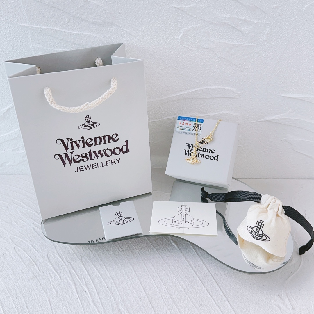 Vivienne Westwood gold full-diamond planet brooch necklace. Exquisite planet design, dreamy and charming. Ideal for daily wear or special occasions. CNC engraved logo.