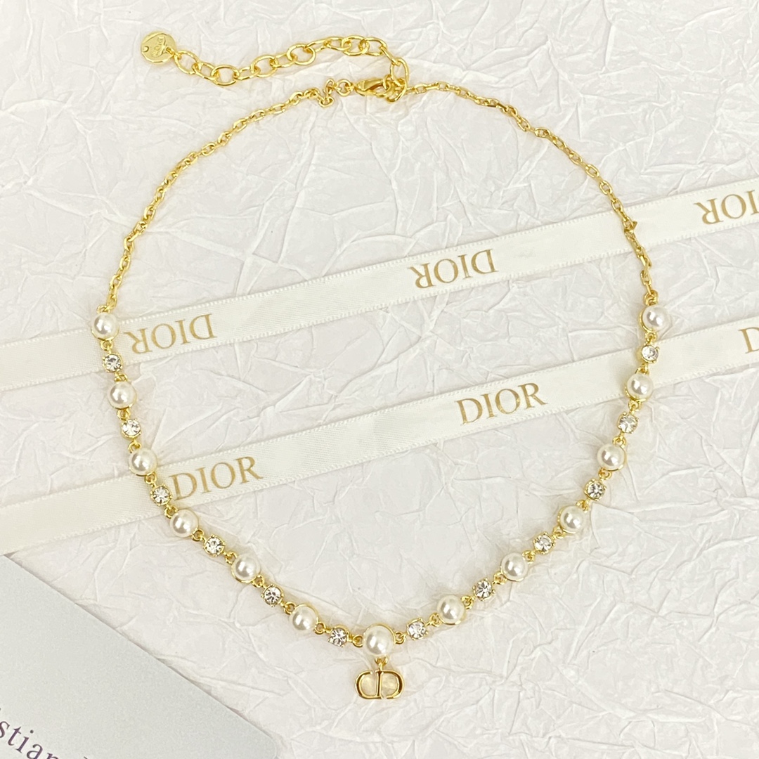 Dior Crystal Pearl CD Necklace: Elegant and charming, featuring pearl and crystal accents with a CD pendant. Perfect for any outfit, highlighting your unique style.