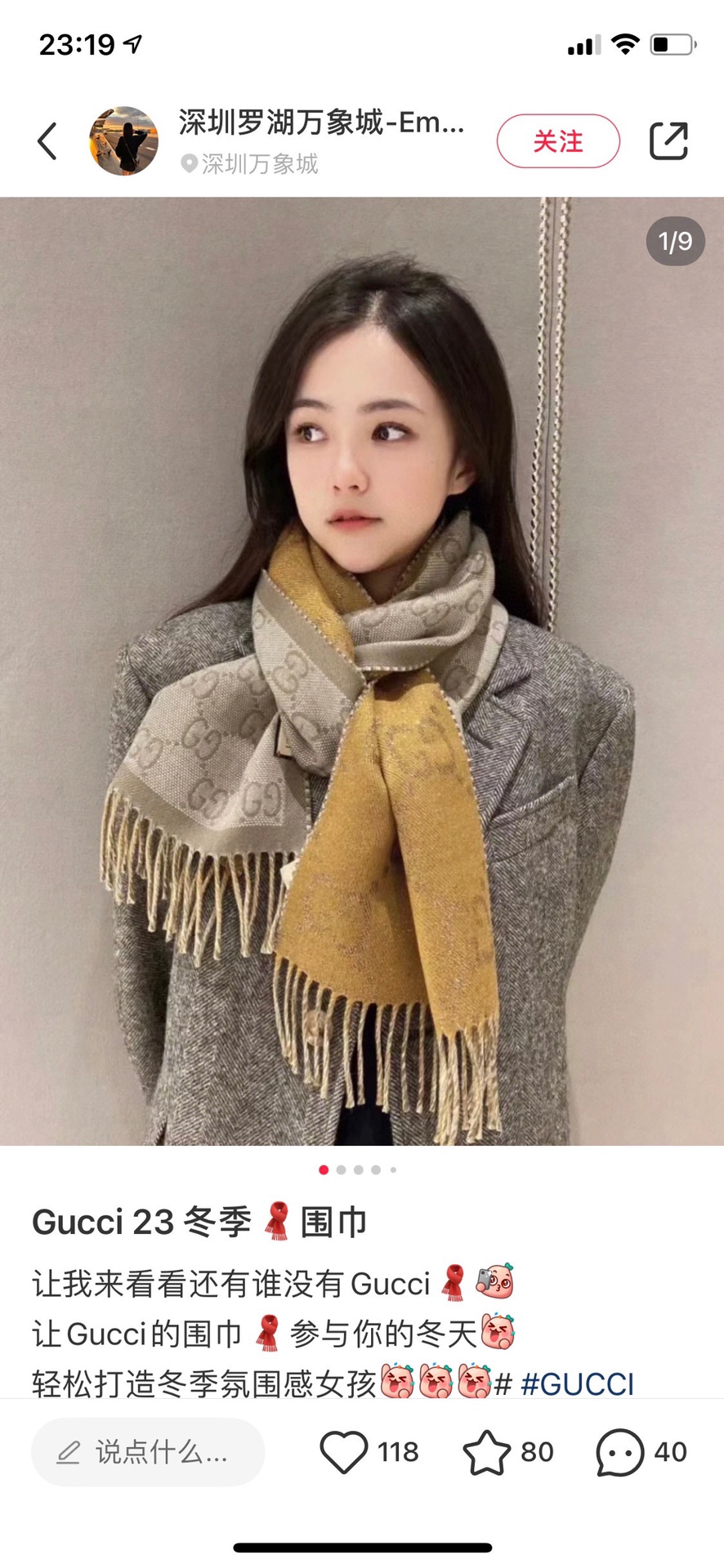 High-end Gucci秋冬新款双面提花围巾,双面GG图案设计,奢华羊毛材质,尺寸34*195cm,时尚保暖。