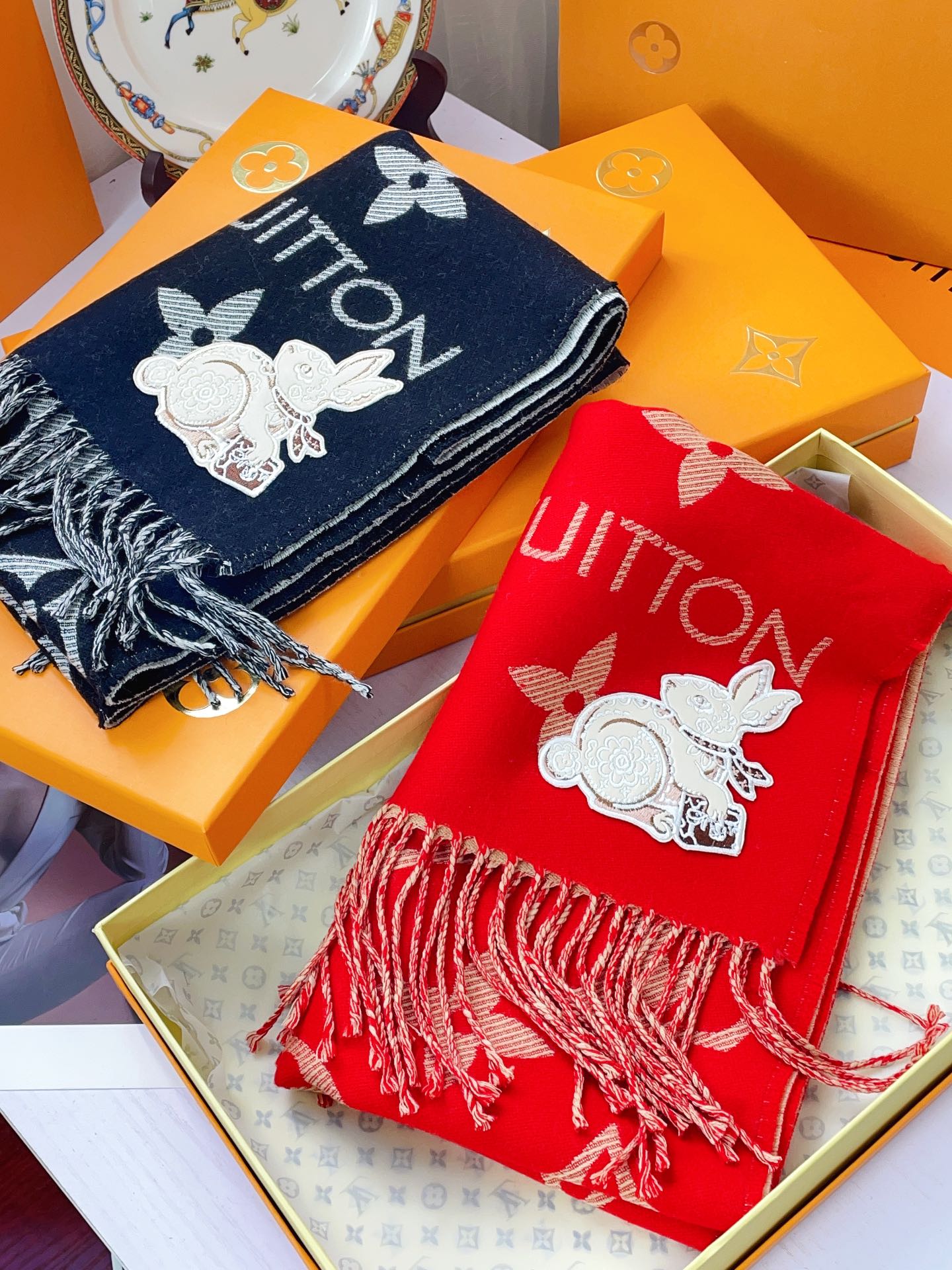 Louis Vuitton 2023 Year of the Rabbit cashmere scarf in beige and red, featuring rabbit and luggage patterns. Limited edition, 100% wool, 35x180cm.
