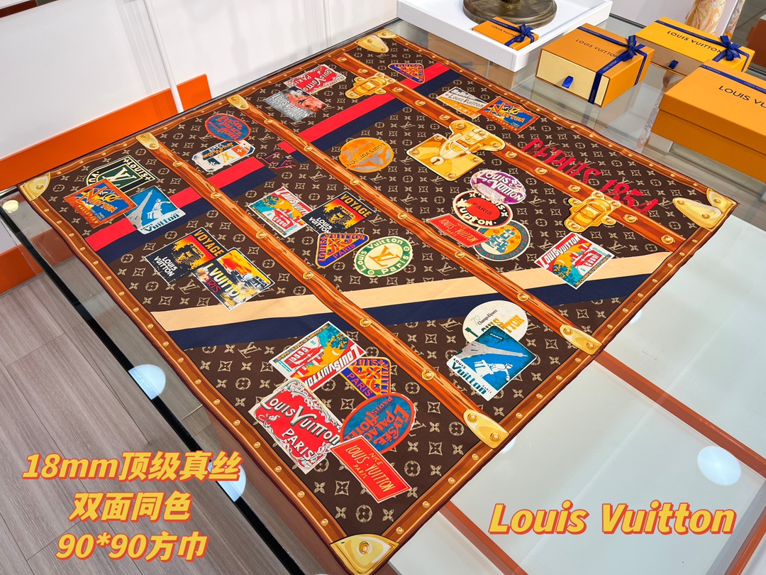 LV square scarf: classic gold thread with silk-wool blend. 140x140cm, 57% wool, 43% silk.