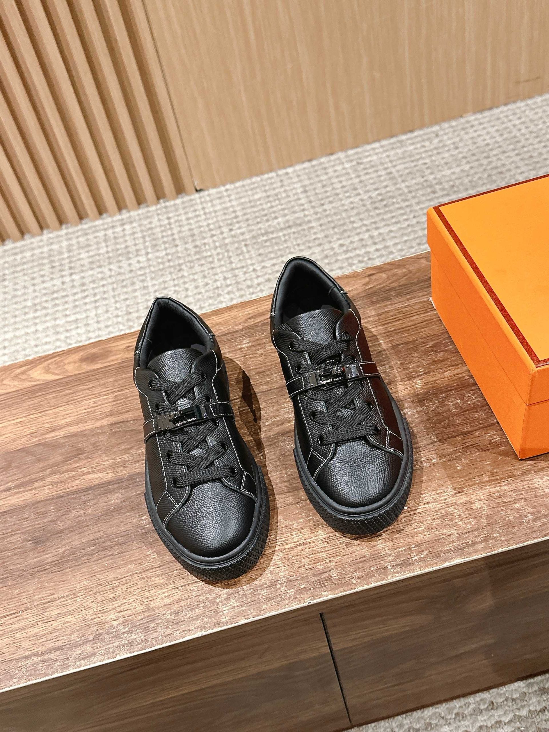 Hermes Kelly sneakers for couples, classic design with palladium buckle. Versatile, matches skirts or pants. High-quality leather and canvas, available in women's sizes 35-39 and men's 39-45.