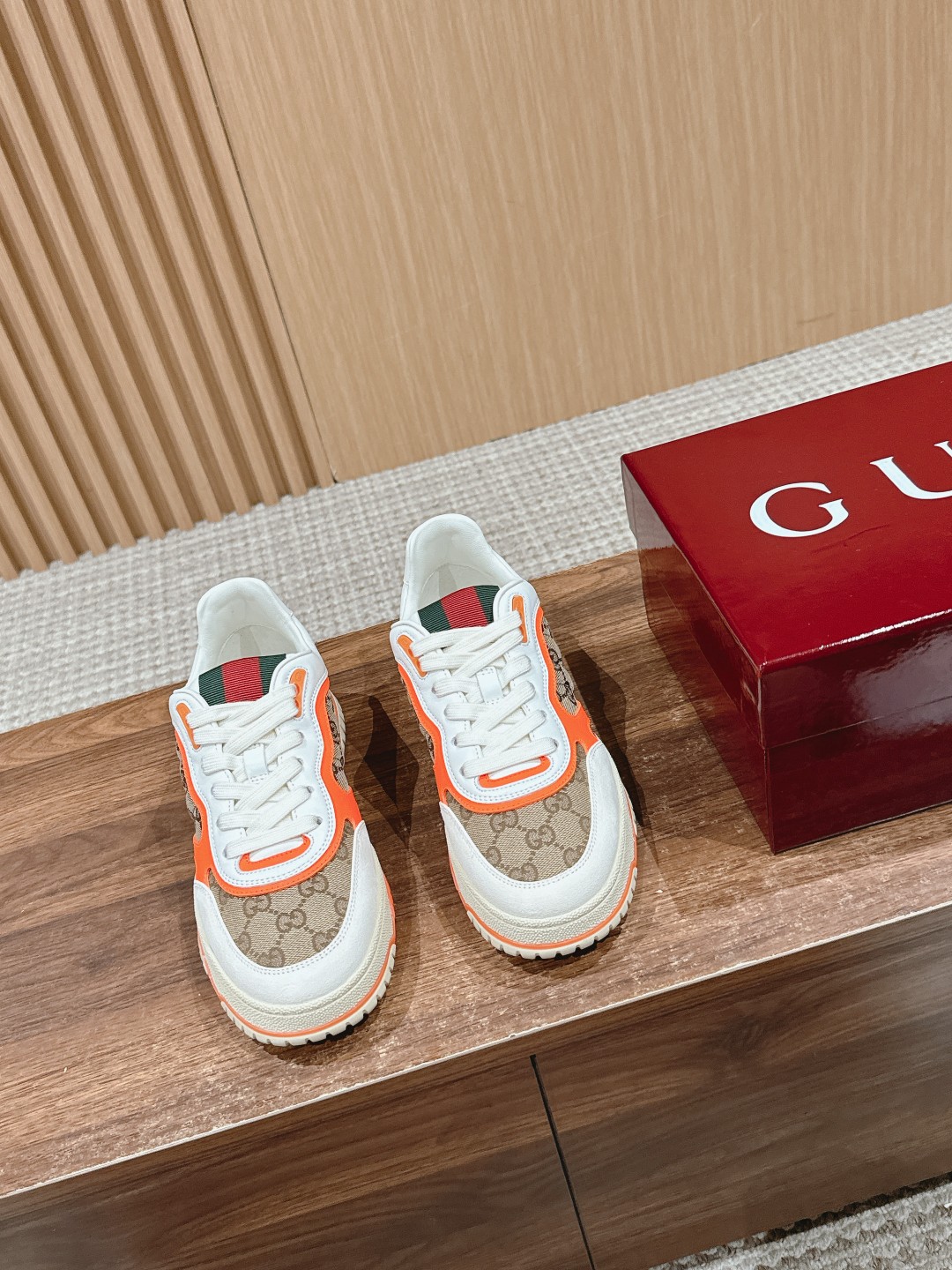 Top version Gucci Re-Web orange sneaker for men. White leather with iconic red/green strap, G motifs. Modern design, classic details. Sizes 39-44M.