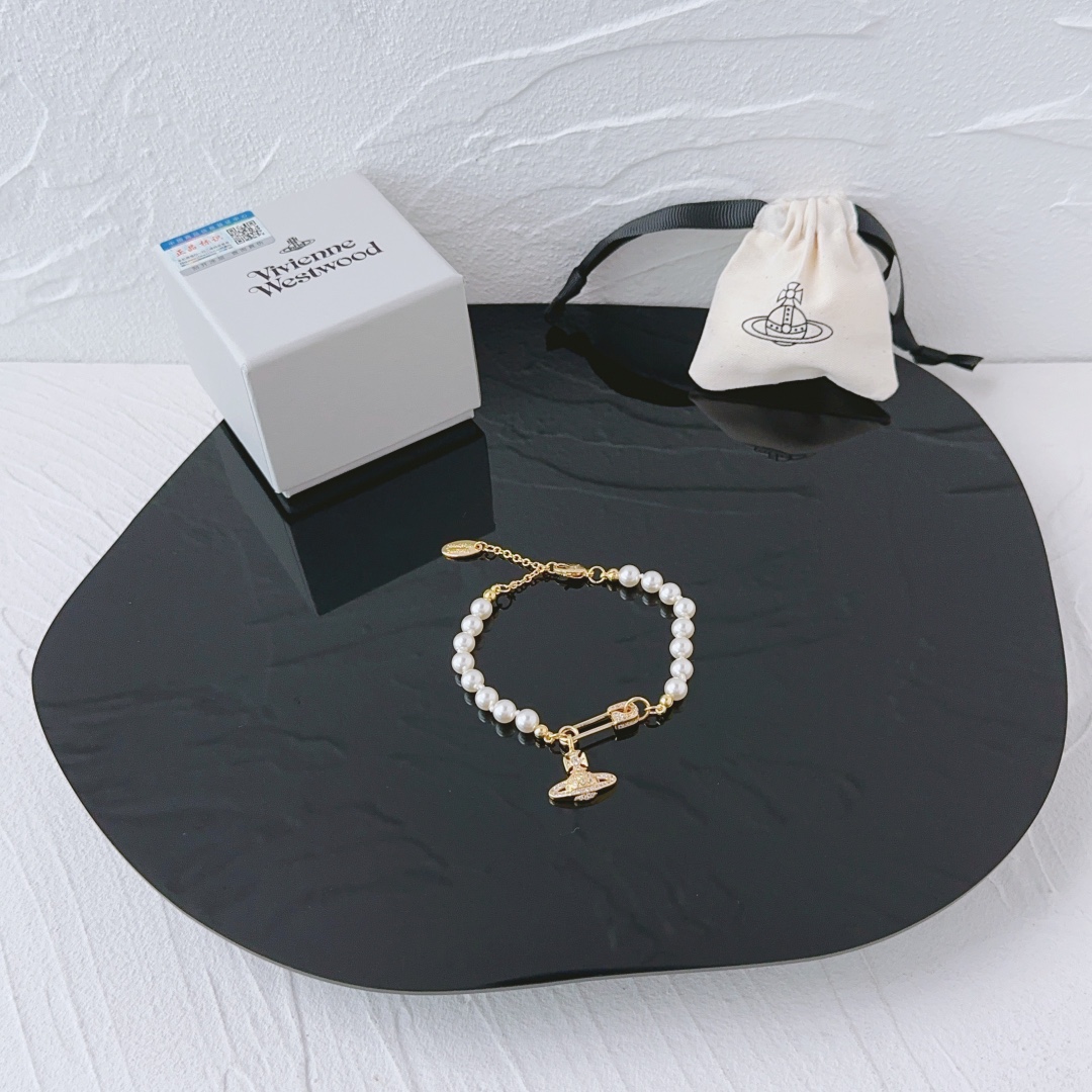 Vivienne Westwood gold pin planet pendant bracelet with pearls. Elegant, versatile design for daily wear or special occasions. Adjustable 16-20cm.