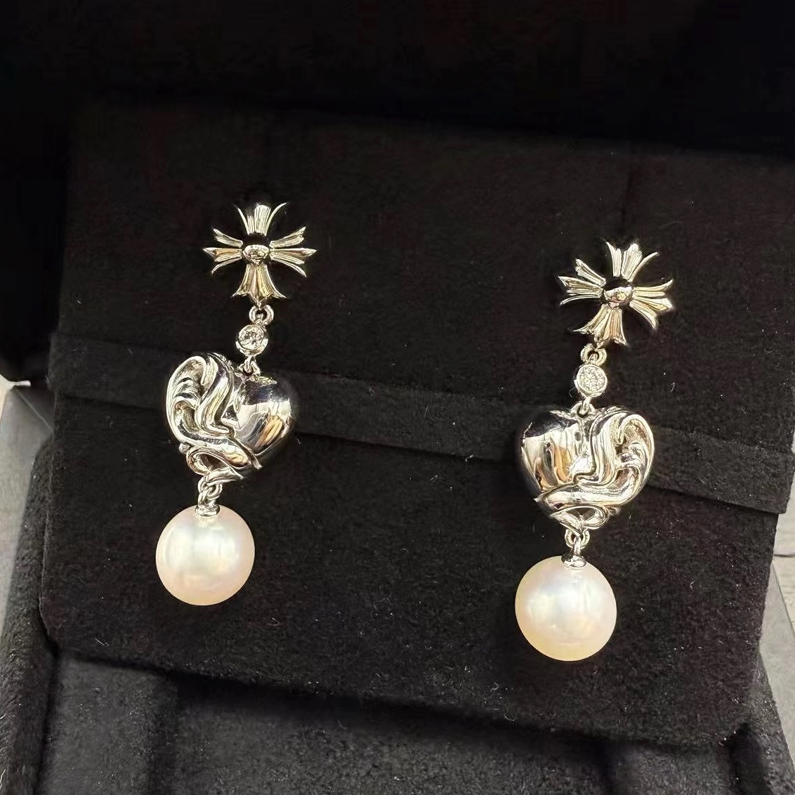 Chrome Hearts x Mikimoto pearl earrings with cross and vine details, combining rock style and elegance. Versatile for various outfits.